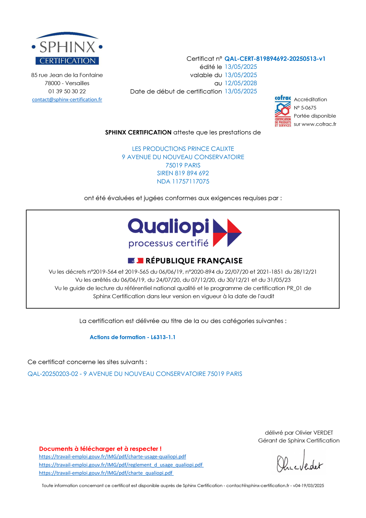 Les Formations Prince Calixte sont certifiées Qualiopi